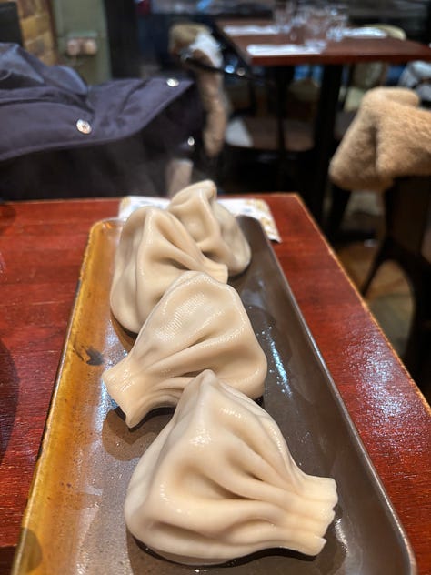 We’ve accidentally developed a family tradition of seeking out Georgian restaurants everywhere we travel. There were several to choose from in the greater London area, but only one of them opened before 6 PM. Theater tickets at 7:30 made the choice for me and I headed into a part of the city I’ve never visited before. I walked out of the tube station onto what felt like a street somewhere in India. The sidewalk was crowded with vendors selling beautiful saris, jewelry of all kinds and prices, fresh produce, home appliances and just about anything else you might need. People bartered and haggled all around me and not a word of it was in English. I kept walking down some slightly dodgy side streets and finally found the tiny Georgian restaurant. No more than ten tables, and I was the only one there at that early hour. The staff was attentive and the khinkali were some of the best I’ve had (I had to skip the khachapuri, since I can’t eat a whole one on my own). One benefit of only paying for only one dinner is that I can order wine and dessert, and both were delicious.
